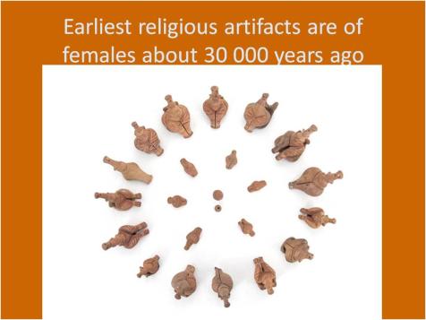 At present the archaeological record shows that the first artefacts to have been made by homo-sapiens about 30 000 years ago, were figurines of pot-bellied, broad hipped women.